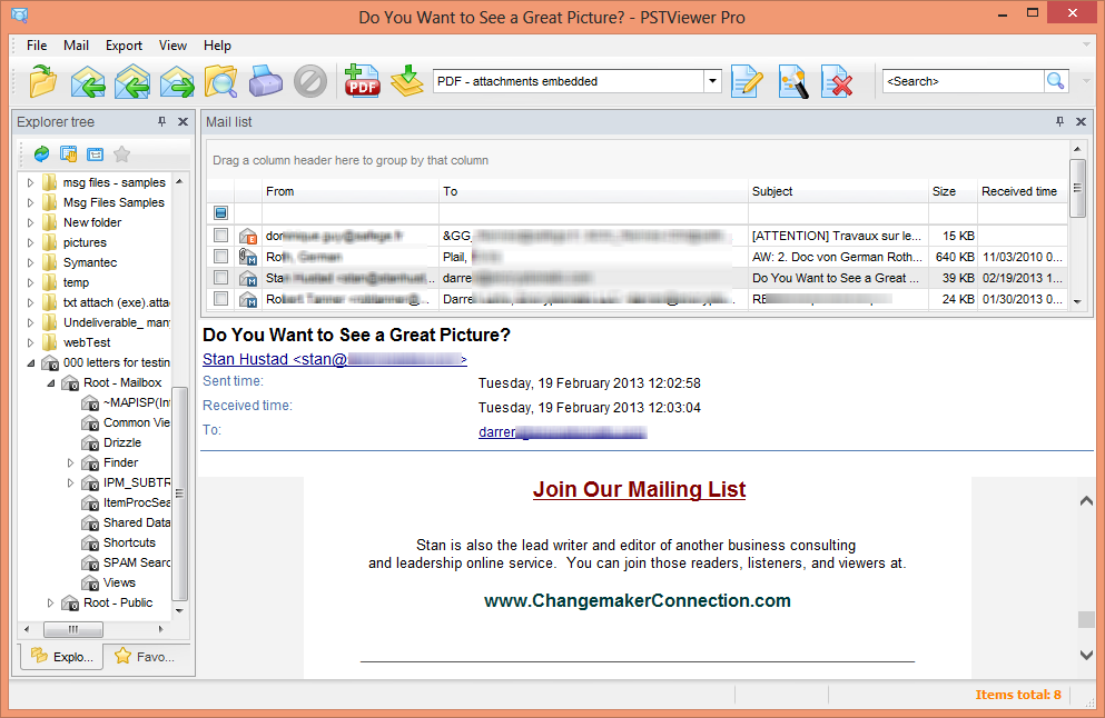 Some times it is convenient to save a message as a pdf or image file. Pst Viewer Pro provides strong capabilities in this area. Converting email is a simple matter of selecting the messages you want to export and then indicating the desired format from the main toolbar.